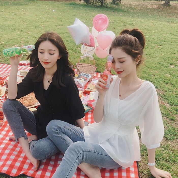 韓国風 ブラウス シャツ トップス シフォン 5分袖 カシュクール ウエストシェイプ 透け感 薄手 シアー スタイルアップ フェミニン きれいめ 大人女子 お出かけ デート 春 夏 RB-A06-0127