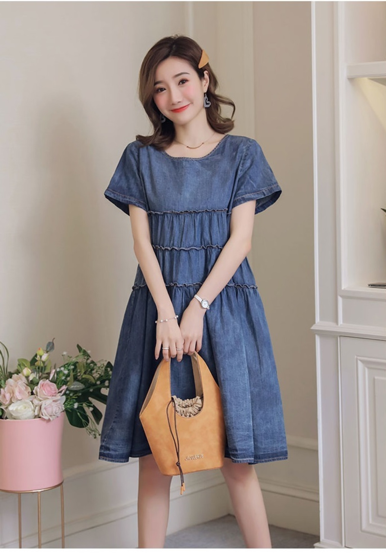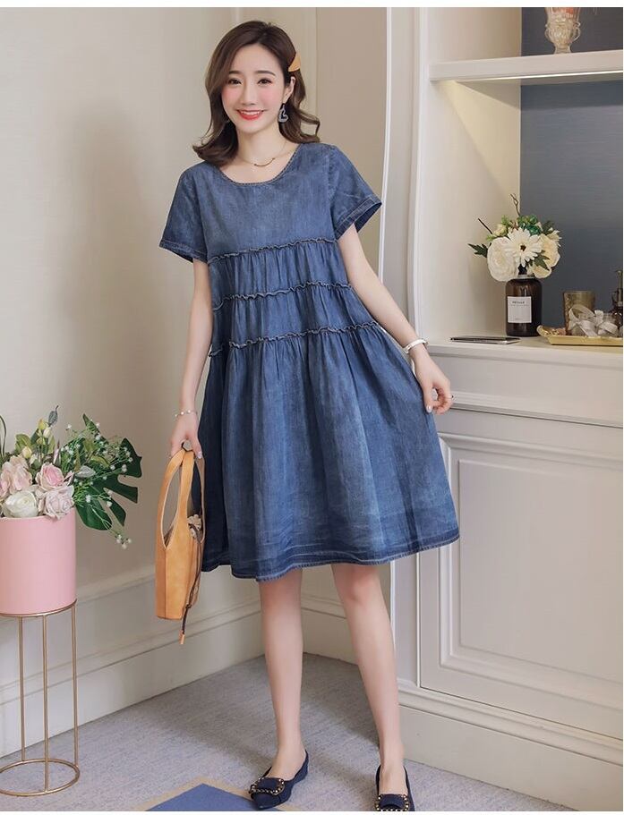 デニム風ワンピース 半袖 ひざ上 ミドル丈 カジュアル ガーリー かわいい ゆったり マタニティ RB-2004-0108