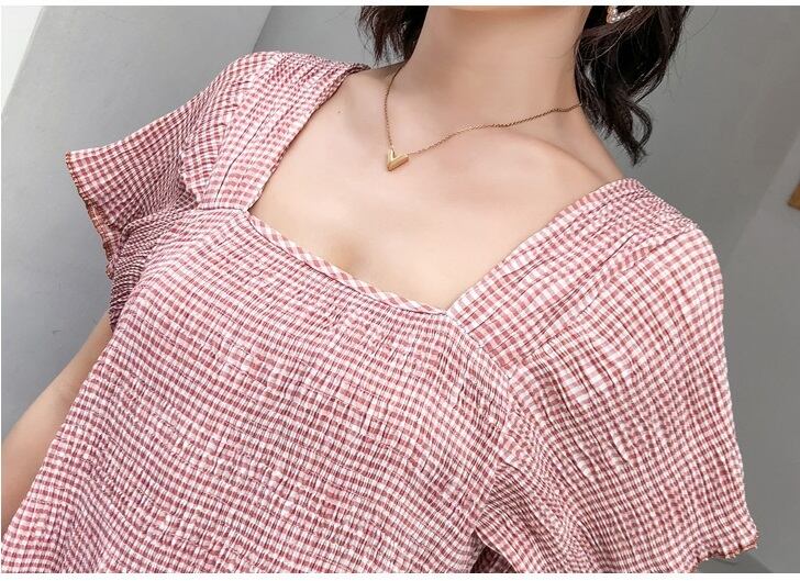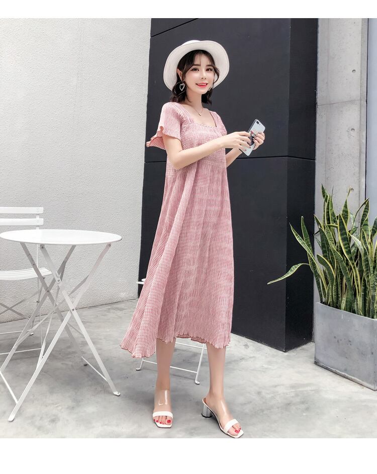 ワッシャーワンピース チェック柄 スクエアカラー 半袖 バッククロス ミモレ丈 ミドル丈 ガーリー かわいい ゆったり マタニティ 春 夏 RB-2004-0116
