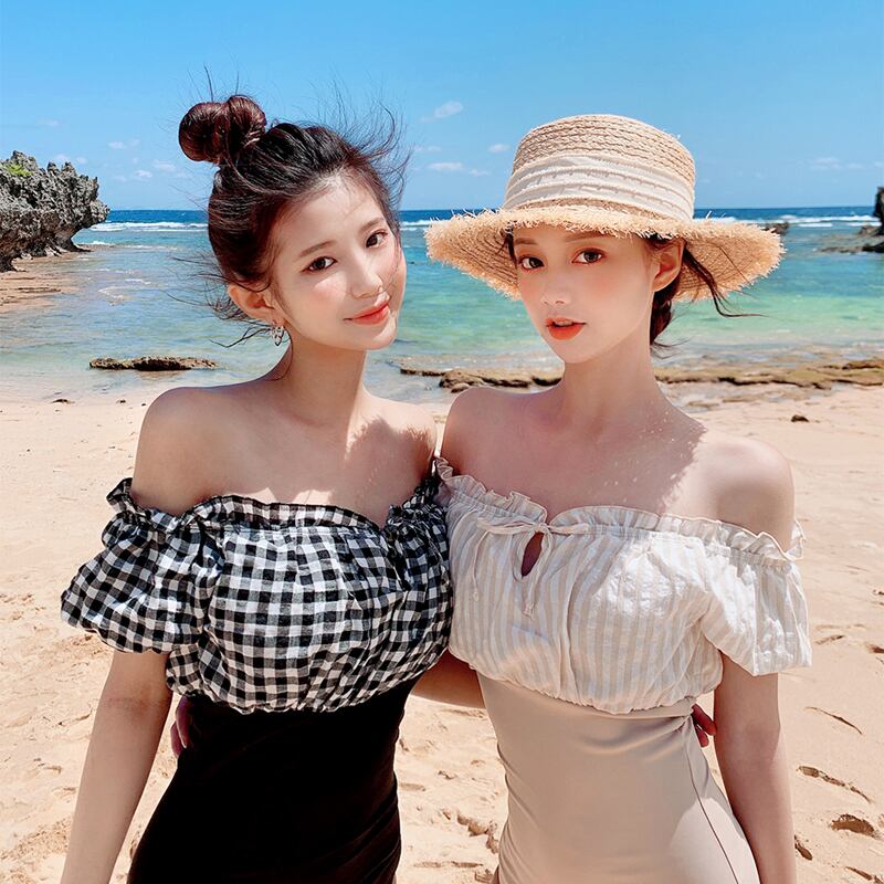 水着 ワンピース オールインワン オフショルダー ハイウエスト 体型カバー ギンガムチェック ストライプ ブラック ベージュ ガーリー フェミニン レトロ 夏 ビーチ 海 プール リゾート RB-I06-0064