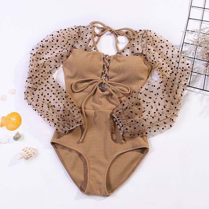 水着 ワンピース オールインワン チュール ドット 長袖 レースアップ 体型カバー ベージュ フェミニン きれいめ 上品 夏 ビーチ 海 プール リゾート RB-I06-0065