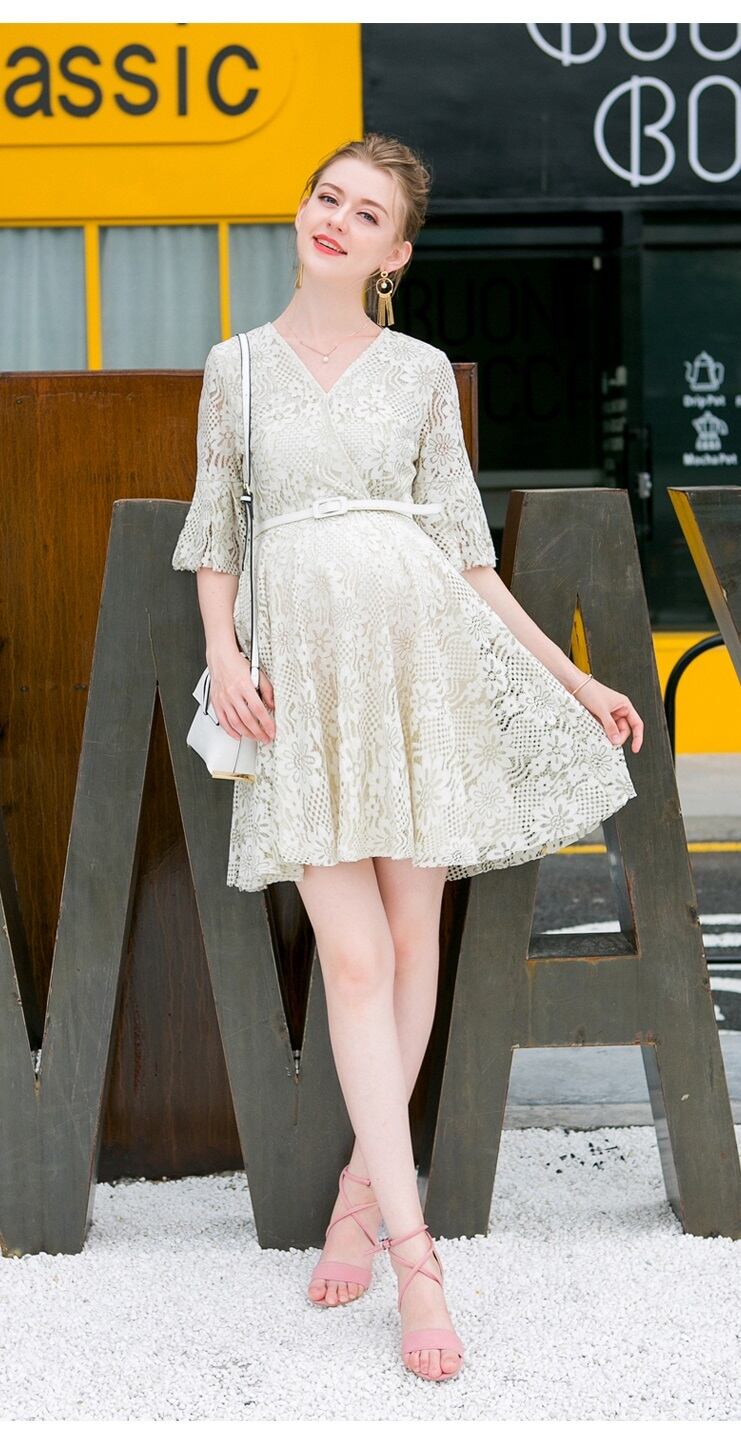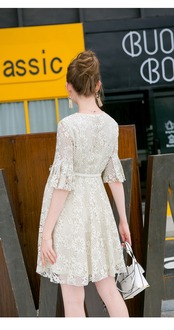 レースワンピース ドレス 透け感 上品 Vネック 5分袖 ひざ上 ミドル丈 ガーリー かわいい ゆったり マタニティ 春 夏 RB-2004-0146