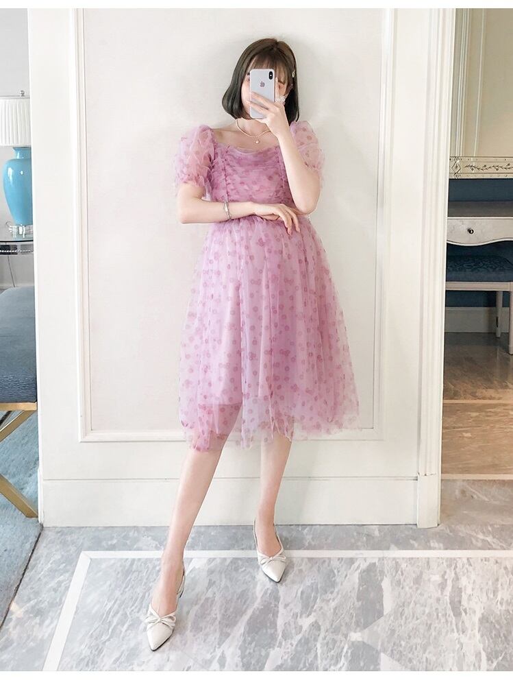 花柄ワンピース ドレス メッシュ 透け感 パフスリーブ 半袖 ミドル丈 ゆったり マタニティ ガーリー かわいい 春夏 RB-2004-0150