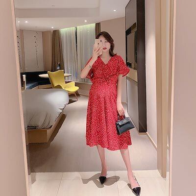 ドット ワンピース マタニティ ゆったり ひざ下 半袖 春夏 Vネック ウエストデザイン レッド フェミニン RB-S06-0037