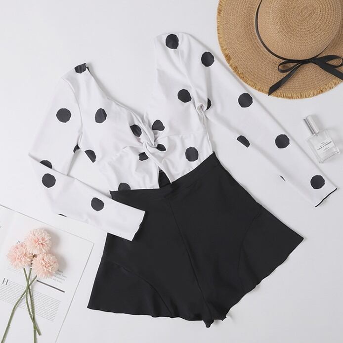水着 ワンピース オールインワン Vネック フレア 体型カバー ドット柄 レッド ブラック レトロ ガーリー フェミニン 夏 ビーチ 海 プール リゾート RB-I06-0099