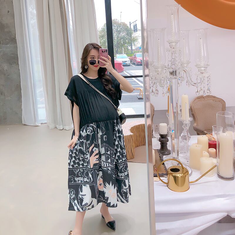 マタニティ ワンピース 切り替え 柄 春夏 半袖 ゆったり カジュアル ロング丈 マキシ丈 ラウンドネックRB-S06-0047