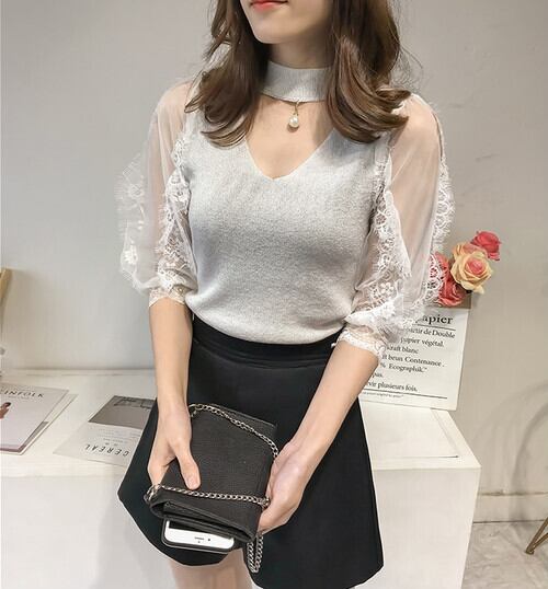4色 feminine チョーカー風 レース袖 ニット トップス シアースリーブ パールアクセント トレンド フェミニン 大人かわいい お出かけ デート 春夏 RB-2007-0001