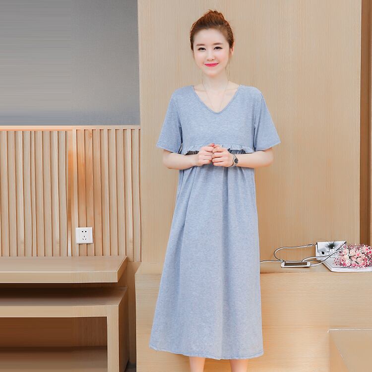 韓国風 マタニティ ワンピース ゆったり 産前産後 授乳 ロング丈 マキシ丈 Vネック 胸フリル フリル 春夏 半袖 ルームウェア RB-S06-0073