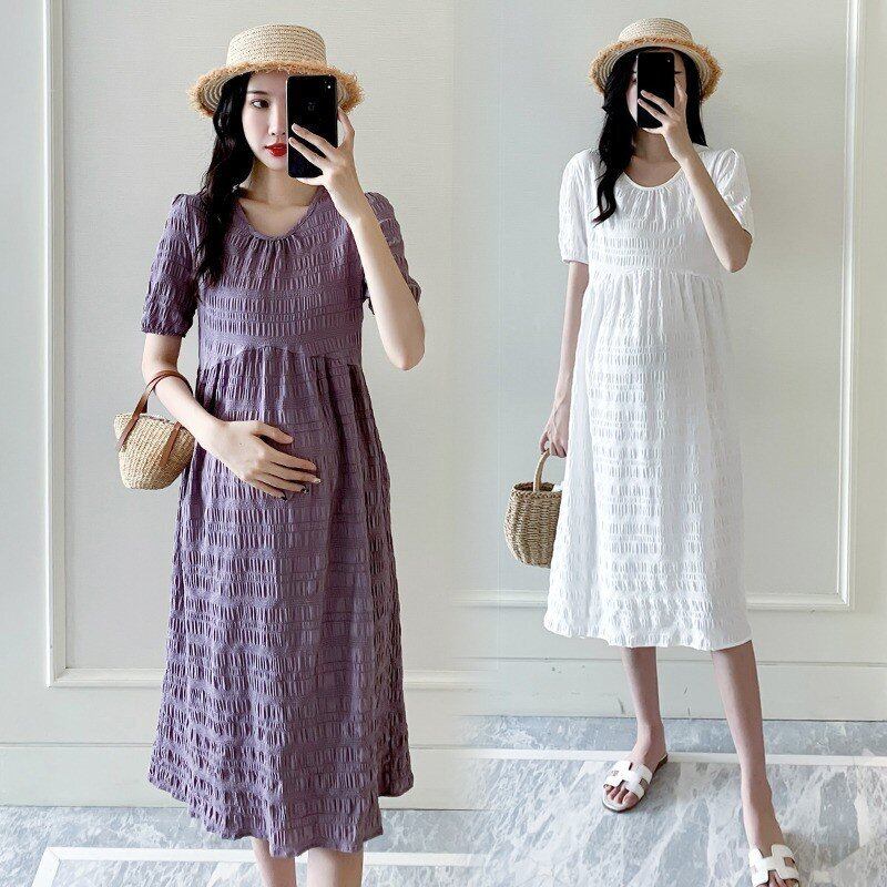 韓国風 マタニティ ワンピース ゆったり ウエストリボン 春夏 半袖 ラウンドネック 抑揚 ひざ下 ミモレ丈 シンプル ガーリー RB-S06-0083