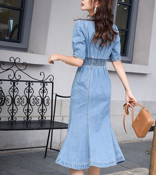 ロングワンピース マーメイド feminine デニム Vネック ハイウエスト トレンド フェミニン 大人かわいい RB-2007-0003