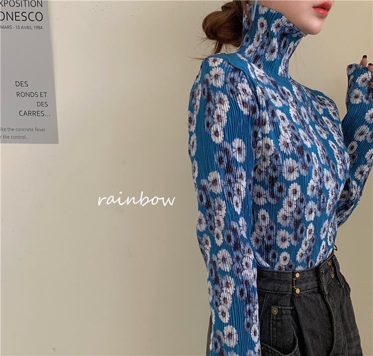 小花柄のトップス 花柄 レトロ デイジー タートルネック 長袖 Tシャツ シワ感 プリーツ ファッショナブル トレンド RB-A07-0001
