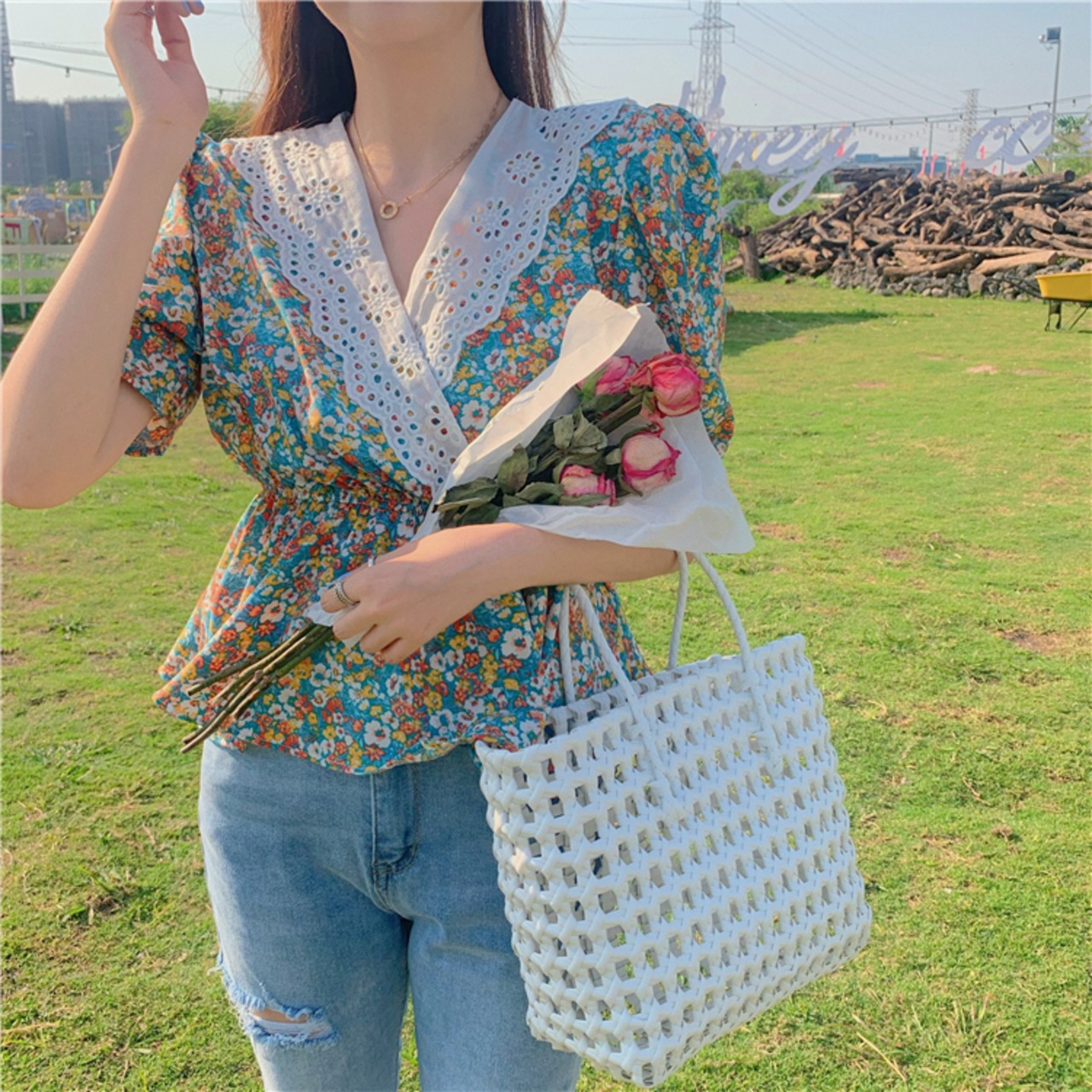 小花柄のトップス 花柄 レトロ ブラウス 半袖 レース襟 Vネック カシュクール風 ペプラム フリル ハイウエスト スタイルアップ ガーリー 甘トップス 夏 RB-A07-0008