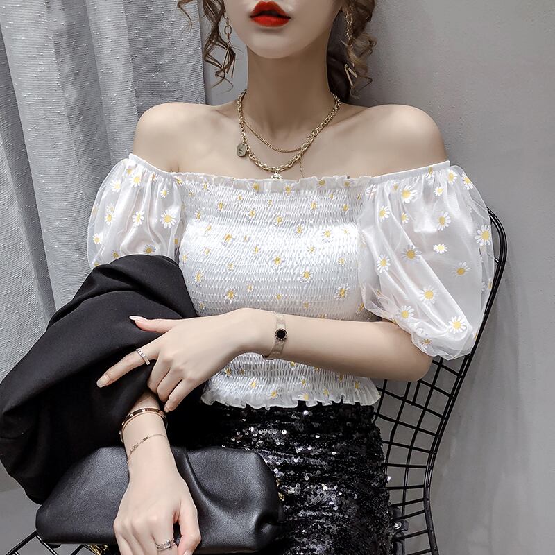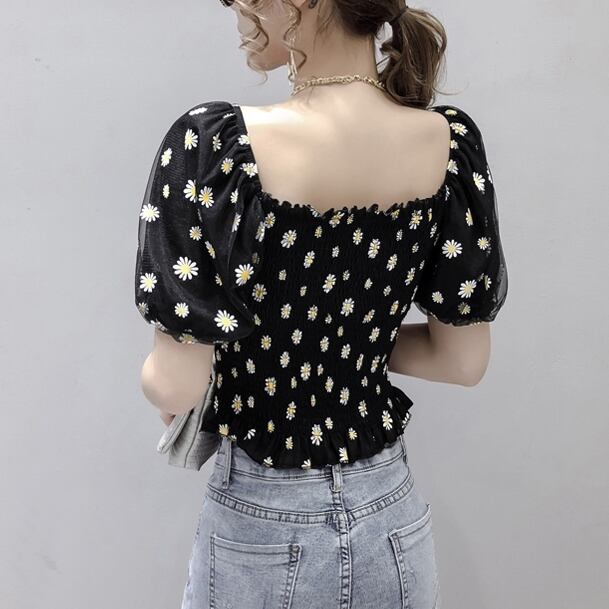 小花柄のトップス 花柄 レトロ フラワープリント シャーリング ブラウス パフスリーブ オフショル 2way 肩出し 鎖骨見せ ガーリー RB-A07-0013