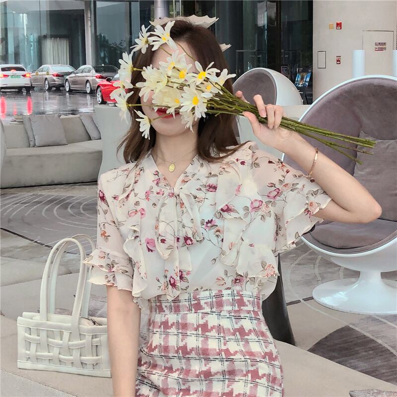 小花柄のトップス 花柄 レトロ シフォン ブラウス 半袖 フローラル フリル リボンカラー 透け感 シアー トレンド きれいめ 通勤 オフィス デート RB-A07-0021