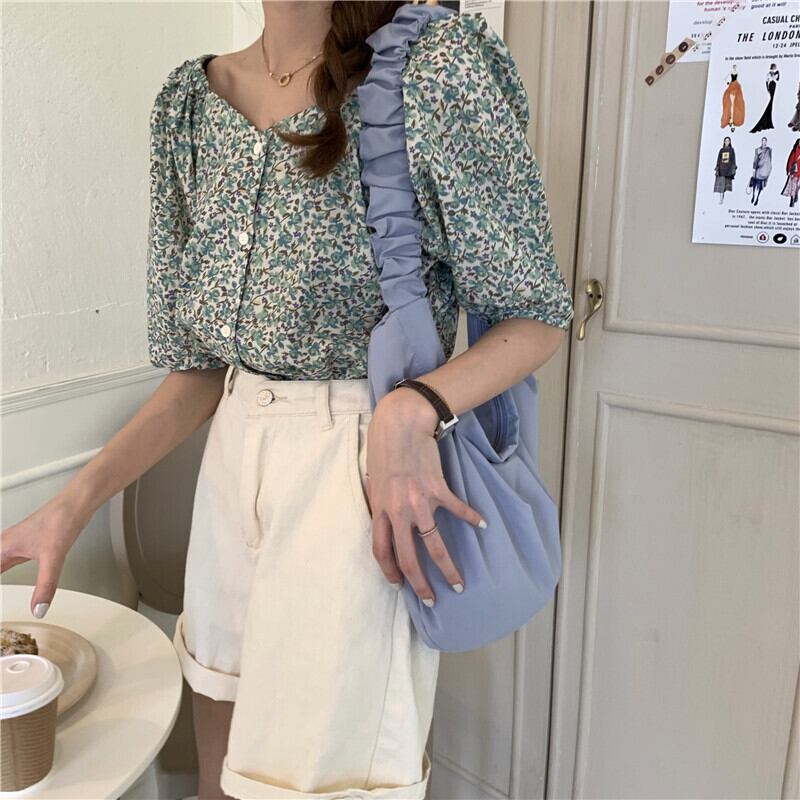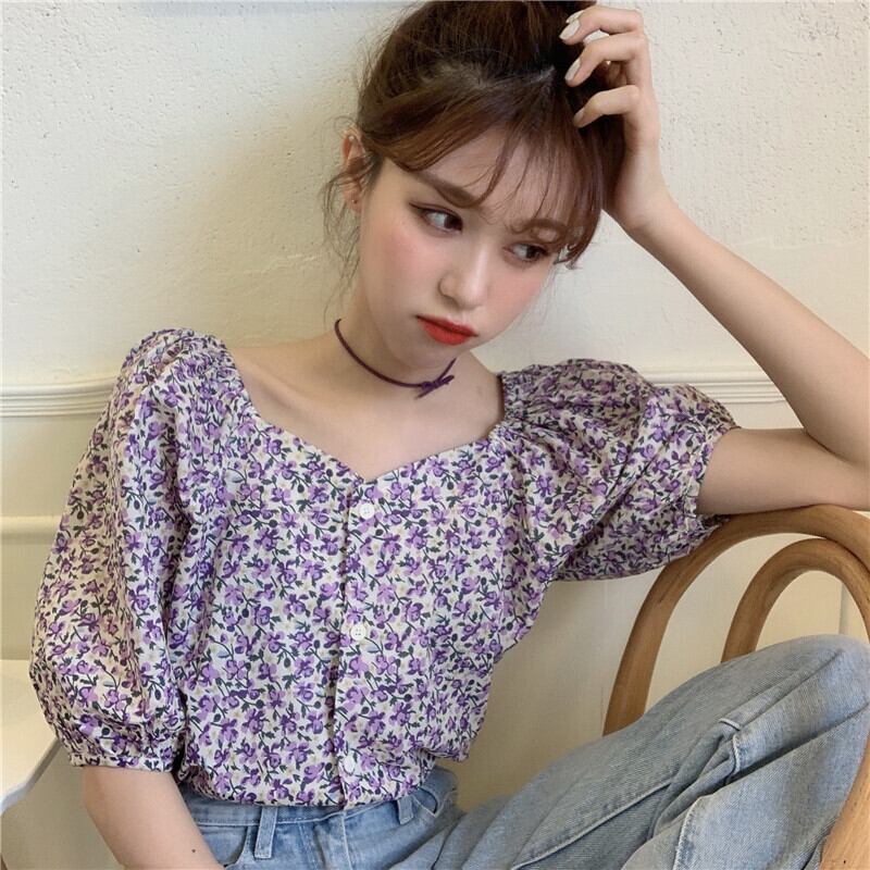 小花柄のトップス 花柄 レトロ ブラウス 半袖 パフスリーブ ボリューム袖 ハートネック 鎖骨見せ ガーリー かわいい きれいめ 甘トップス RB-A07-0022
