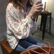 韓国風 小花柄のトップス 花柄 レトロ シフォン ブラウス 長袖 スタンドカラー 透け感 落ち感 柔らか ラグランスリーブ ガーリー 大人かわいい カジュアル 春 夏 RB-A07-0023