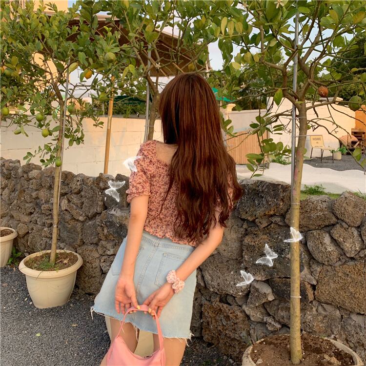 韓国風 小花柄のトップス 花柄 レトロ シフォン シャーリング ブラウス 半袖 キャンディスリーブ ショート丈 薄手 透け感 ガーリー かわいい キュート 夏 デート RB-A07-0024