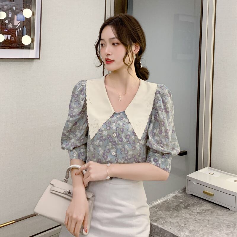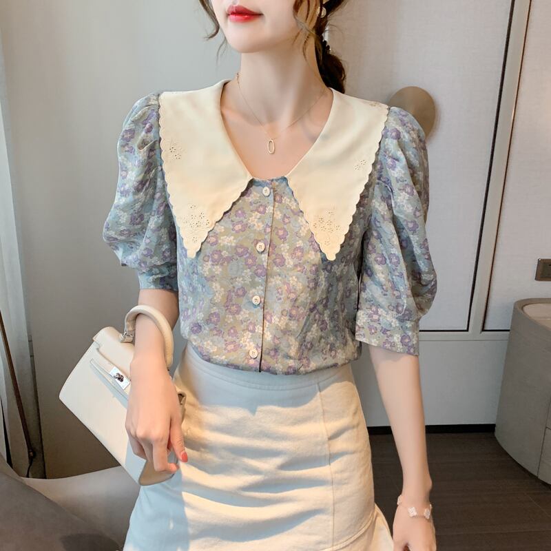 小花柄のトップス 花柄 レトロ フローラル ブラウス 半袖 パフスリーブ レース襟 フェミニン 大人かわいい シック お呼ばれ デート RB-A07-0029