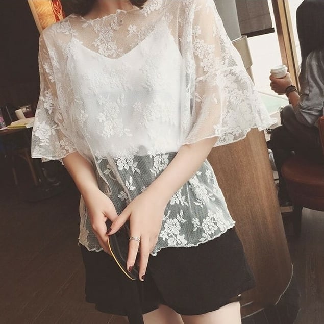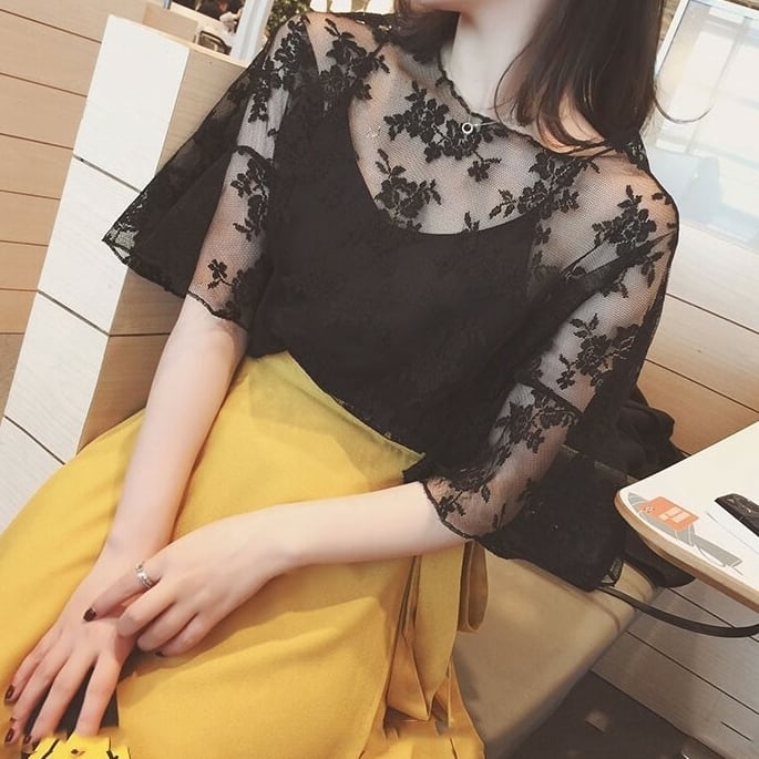 小花柄のトップス 花柄 レトロ シフォン 花柄レース シースルー ブラウス キャミソール付き セットアップ ベルスリーブ 透け感 トレンド フェミニン きれいめ お出かけ デート RB-A07-0038