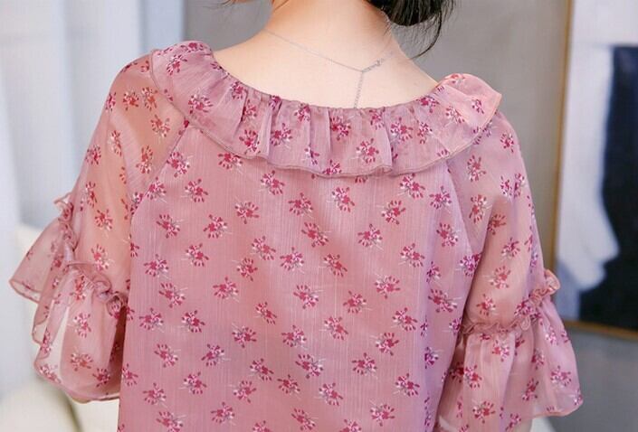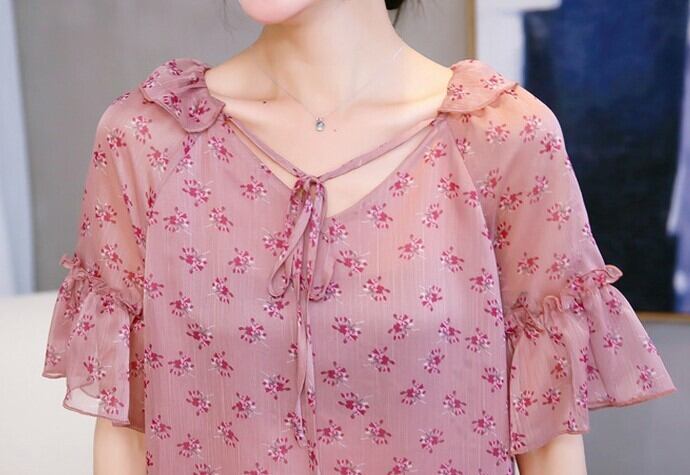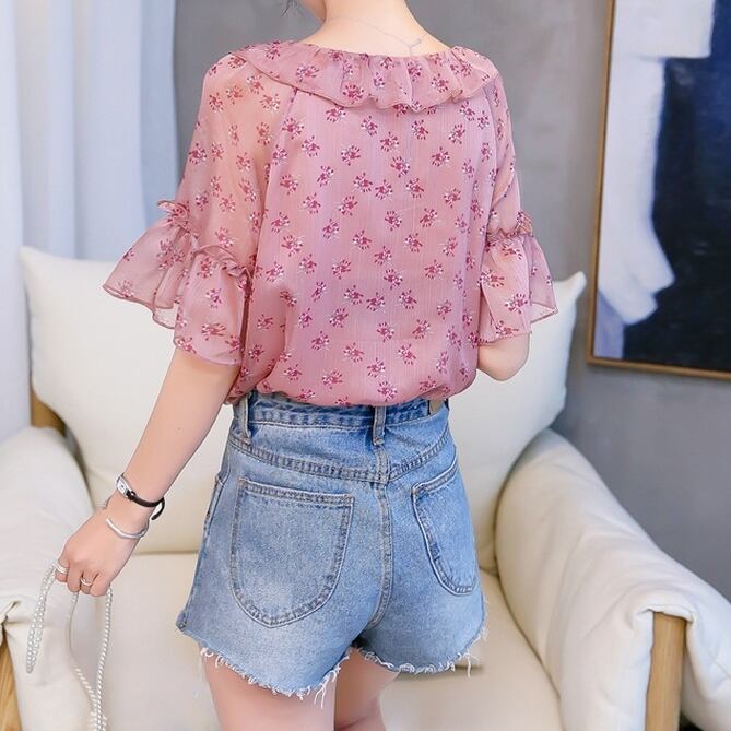 小花柄のトップス 花柄 レトロ フローラル シフォン ブラウス 半袖 Vネック リボン フリル 透け感 大人かわいい フェミニン お出かけ デート RB-A07-0049