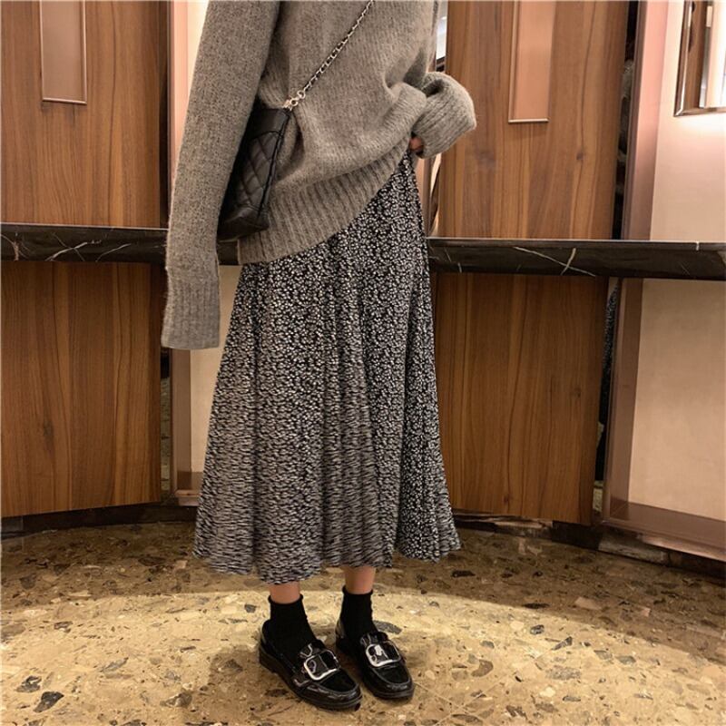 韓国風 小花柄のスカート スカート 花柄 レトロ ロング丈 モノクロ シック ガーリー フレア RB-S07-0001