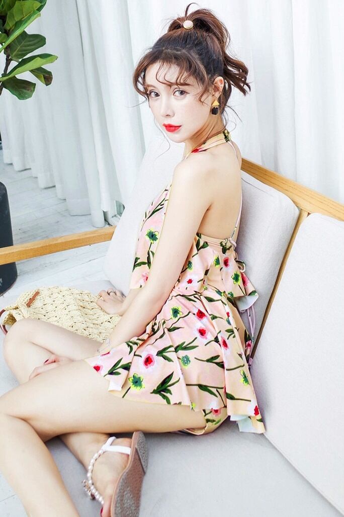小花柄の水着 花柄 レトロ セパレート ホルターネック フレア 体型カバー ピンク ガーリー フェミニン 夏 ビーチ 海 プール リゾート RB-I07-0008