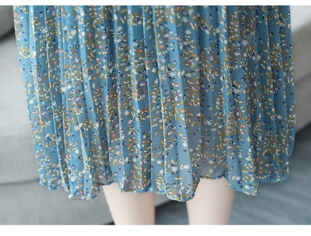 小花柄のプリーツワンピース プリーツワンピース 花柄 レトロ レディース 10代 20代 30代 40代 アラフォーアラサー ロング丈 マキシ丈 Aライン カジュアル 長袖 ウエストマーク ハイウエスト ボトルネック リボン 上品 シフォン 膝下丈 ブルー S M L XL 2XL RB-Z07-0005