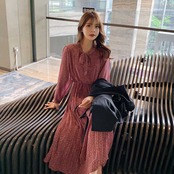 小花柄のプリーツワンピース プリーツワンピース 花柄 レトロ レディース 10代 20代 30代 アラサー ロング丈 マキシ丈 Aライン カジュアル 長袖 レッド ブラック ワンサイズ RB-Z07-0006
