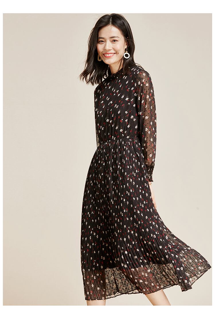 小花柄のプリーツワンピース プリーツワンピース 花柄 レトロ レディース 10代 20代 30代 アラサー ロング丈 マキシ丈 Aライン カジュアル 長袖 ホワイト ブラック ボトルネック タートルネック 膝下丈 ミモレ丈 フレア 上品 シフォン ハイウエスト 脚長効果 RB-Z07-0008