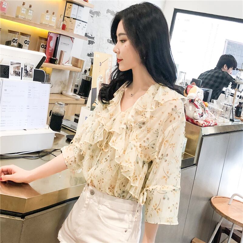 小花柄のトップス 花柄 レトロ シフォン 半袖 ブラウス Vネック フリル リボン 柔らか ナチュラル かわいい シアー トレンド 大人かわいい 通勤 デート 女子会 RB-A07-0063