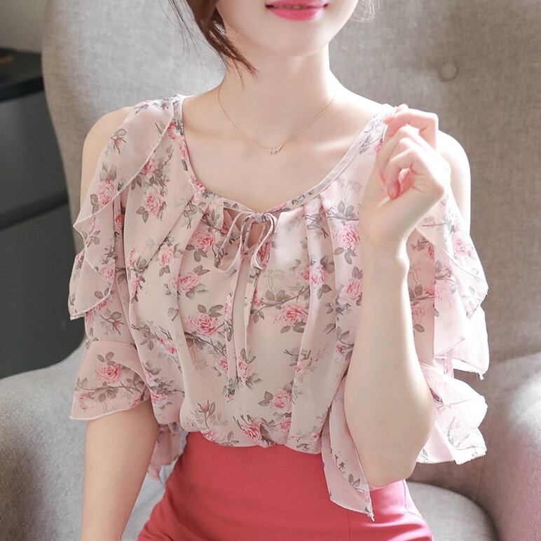 小花柄のトップス 花柄 レトロ ブラウス シフォン 半袖 ラウンドネック リボン カットショルダー オープンショルダー 透け感 シアー フェミニン 上品 きれいめ 大人かわいい デート お食事 お呼ばれ RB-A07-0067