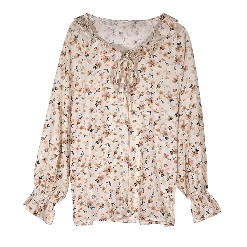 小花柄のトップス 花柄 レトロ 長袖 シフォン ブラウス リボン フロントボタン キャンディスリーブ 透け感 シアー トレンド 日焼け防止 カジュアル ガーリー デイリー 普段使い RB-A07-0071
