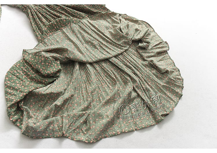 小花柄のプリーツワンピース プリーツワンピース 花柄 レトロ レディース 10代 20代 30代 アラサー Aライン カジュアル ハイウエスト 脚長効果 シフォン ロング丈 マキシ丈 長袖 ワンサイズ グリーン ホワイト ブラック ピンク RB-Z07-00012