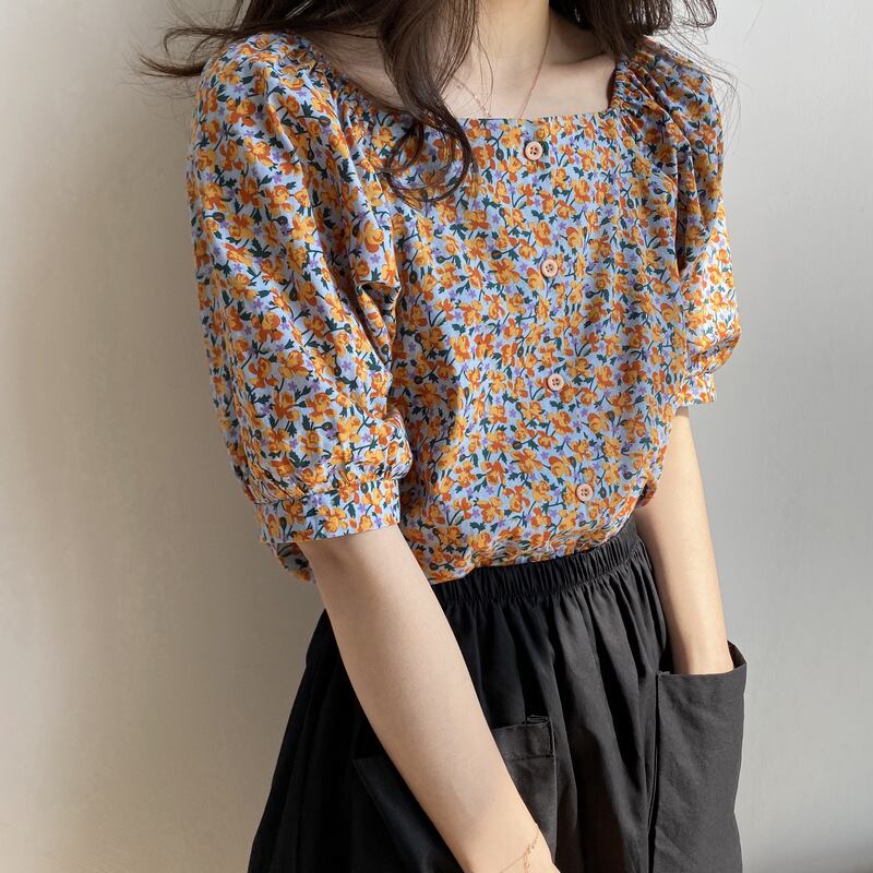 小花柄のトップス 花柄 レトロ フローラルプリント シフォン 半袖 ブラウス パフスリーブ スクエアネック フロントボタン ガーリー 大人かわいい カジュアル デイリー 普段使い お出かけ 女子会 RB-A07-0077