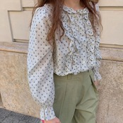 小花柄のトップス 花柄 レトロ フリル ブラウス ラウンドネック キャンディスリーブ シック 大人かわいい 通勤 お出かけ デート 女子会 RB-A07-0083