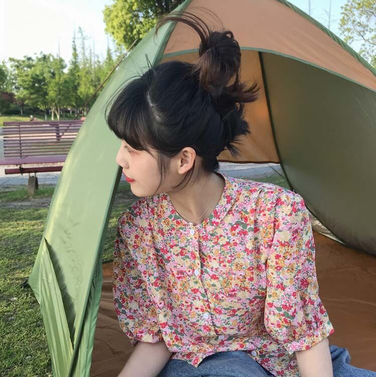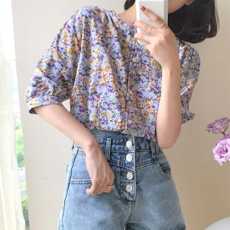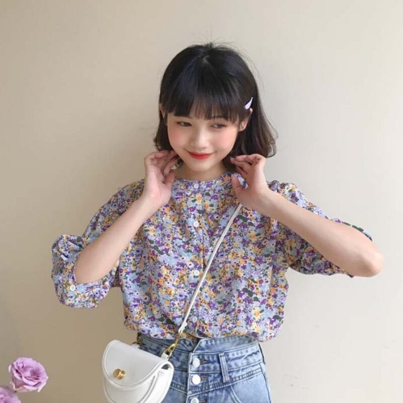 小花柄のトップス 花柄 レトロ ラウンドネック シャツ 半袖 ボリューム袖 ノーカラー フロントボタン カジュアル かわいい キュート デイリー 普段使い お出かけ デート RB-A07-0085