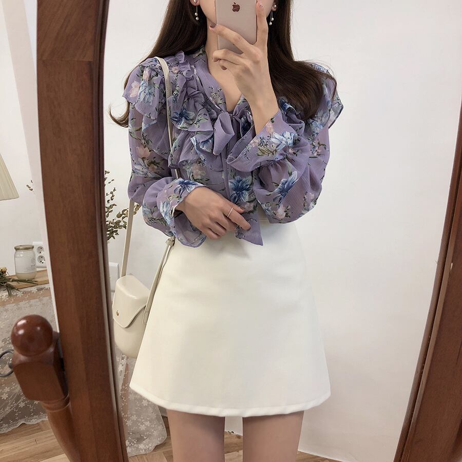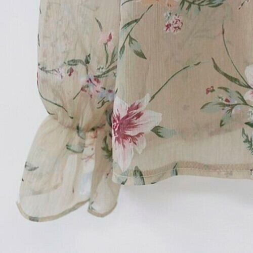 小花柄のトップス 花柄 レトロ フローラル シフォン ブラウス ボウタイ リボン フリル キャンディスリーブ 透け感 シアー トレンド フェミニン 大人かわいい 涼し気 お出かけ デート お呼ばれ RB-A07-0086
