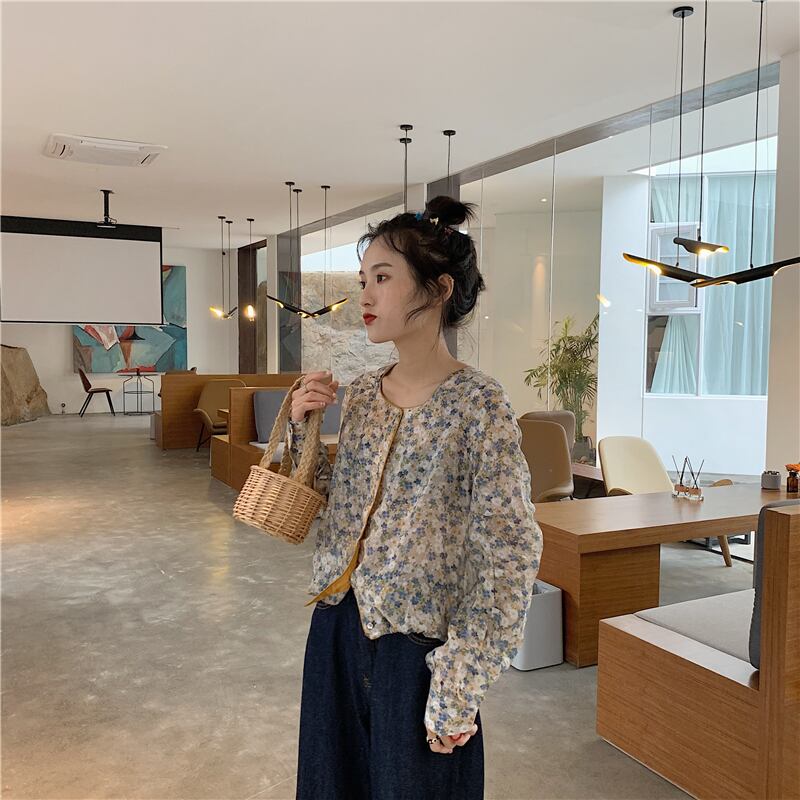 小花柄のトップス 花柄 レトロ フローラル シャツ 長袖 ラウンドネック ノーカラー シャツカーディガン 薄手 透け感 ラブリー かわいい ガーリー 春 夏 RB-A07-0092