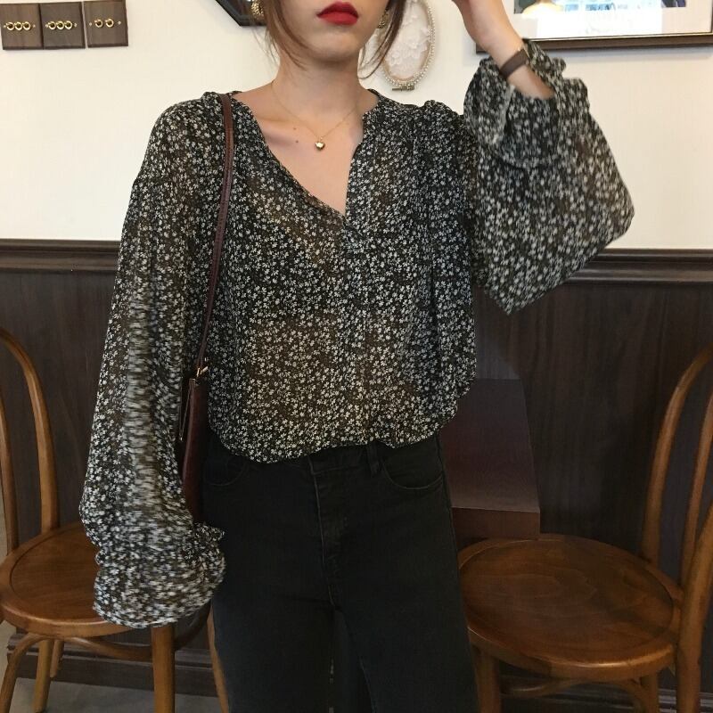 小花柄のトップス 花柄 レトロ シフォン ブラウス スキッパー 長袖 キャンディスリーブ ゆったり 落ち感 透け感 シアー 日焼け防止 シック 通勤 お出かけ デート 女子会 春 夏 RB-A07-0094