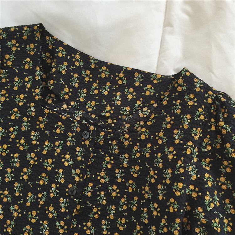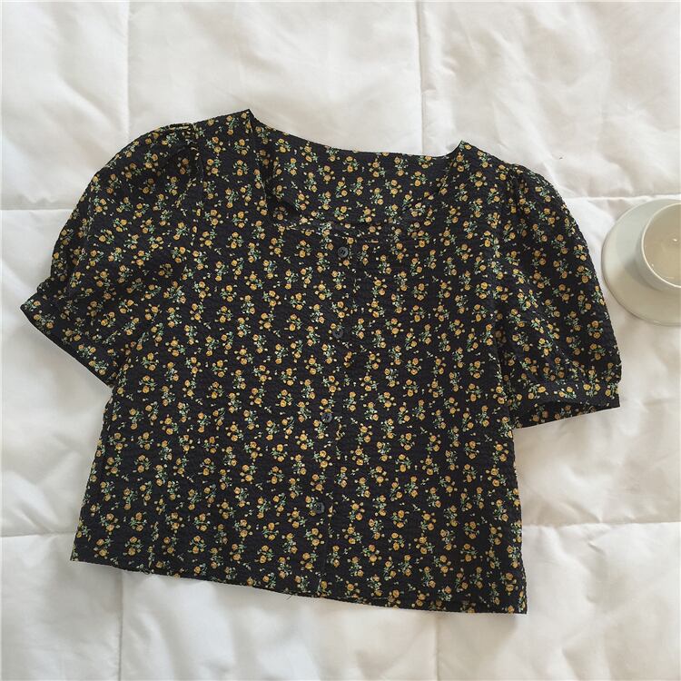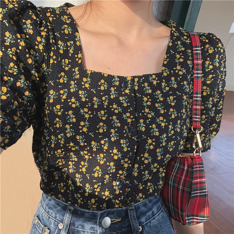 小花柄のトップス 花柄 レトロ シフォン ブラウス パフスリーブ 半袖 スクエアネック フロントボタン シック ガーリー ノスタルジック お出かけ デート 女子会 夏 RB-A07-0100