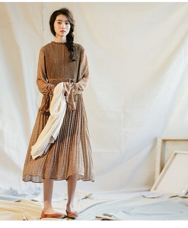 小花柄のプリーツワンピース プリーツワンピース 花柄 レトロ レディース ボトルネック グリーン ブラウン ブルー 10代 20代 30代 アラサー Aライン カジュアル ハイウエスト 脚長効果 シフォン ロング丈 マキシ丈 長袖 フレア袖 RB-Z07-00015