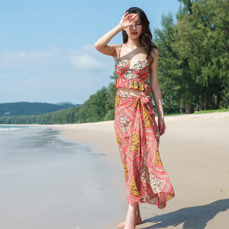 小花柄の水着 花柄 レトロ 3点セット ビキニ ビスチェ パレオ 体型カバー エスニック レッド グリーン フェミニン きれいめ 上品 夏 ビーチ 海 プール リゾート RB-I07-0015