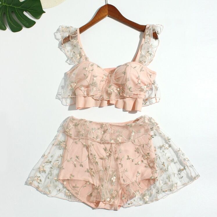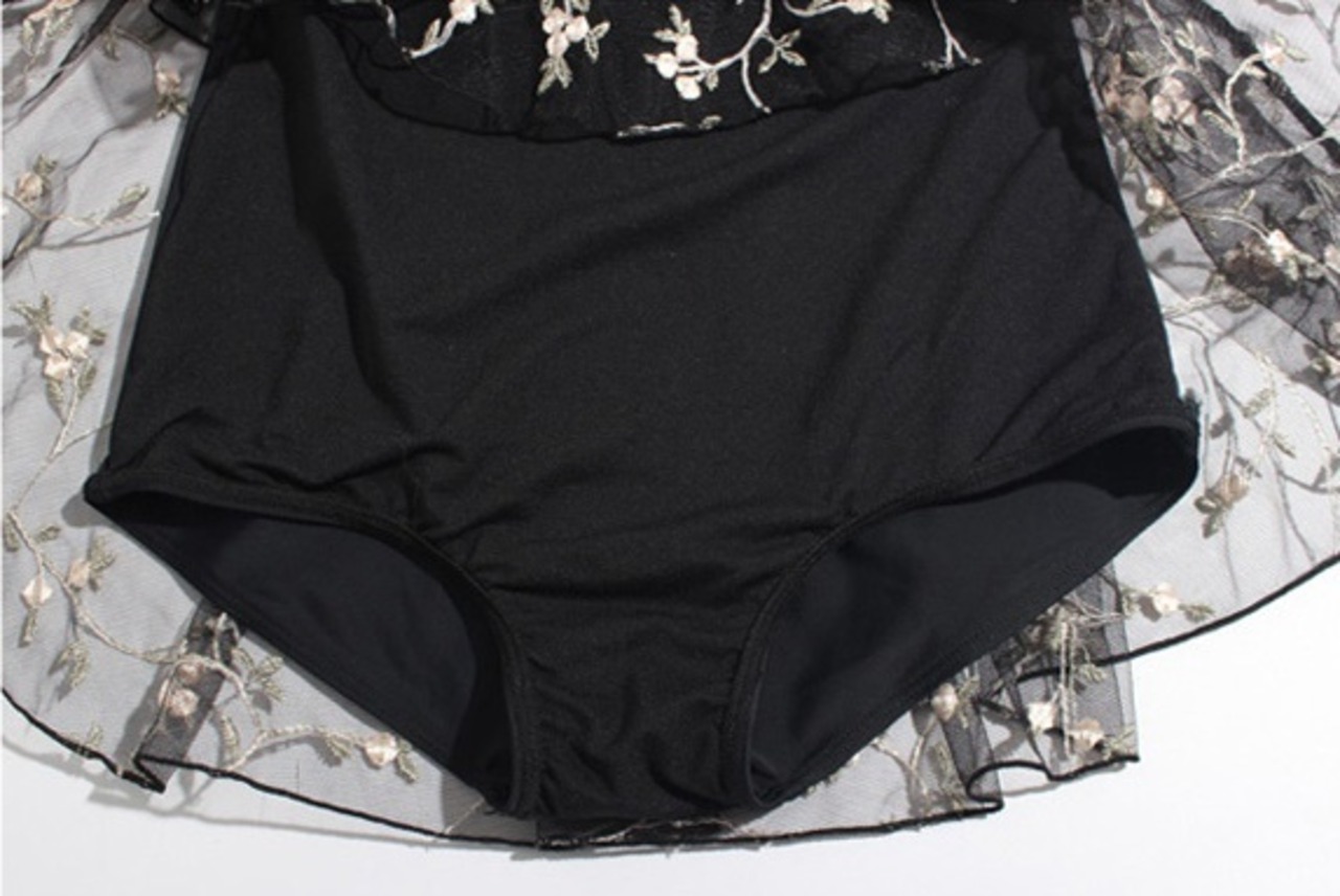 小花柄の水着 花柄 レトロ ビスチェ ビキニ ハイウエスト フレア チュール シースルー 刺繍 体型カバー ピンク ブラック ガーリー フェミニン 夏 ビーチ 海 プール リゾート RB-I07-0020