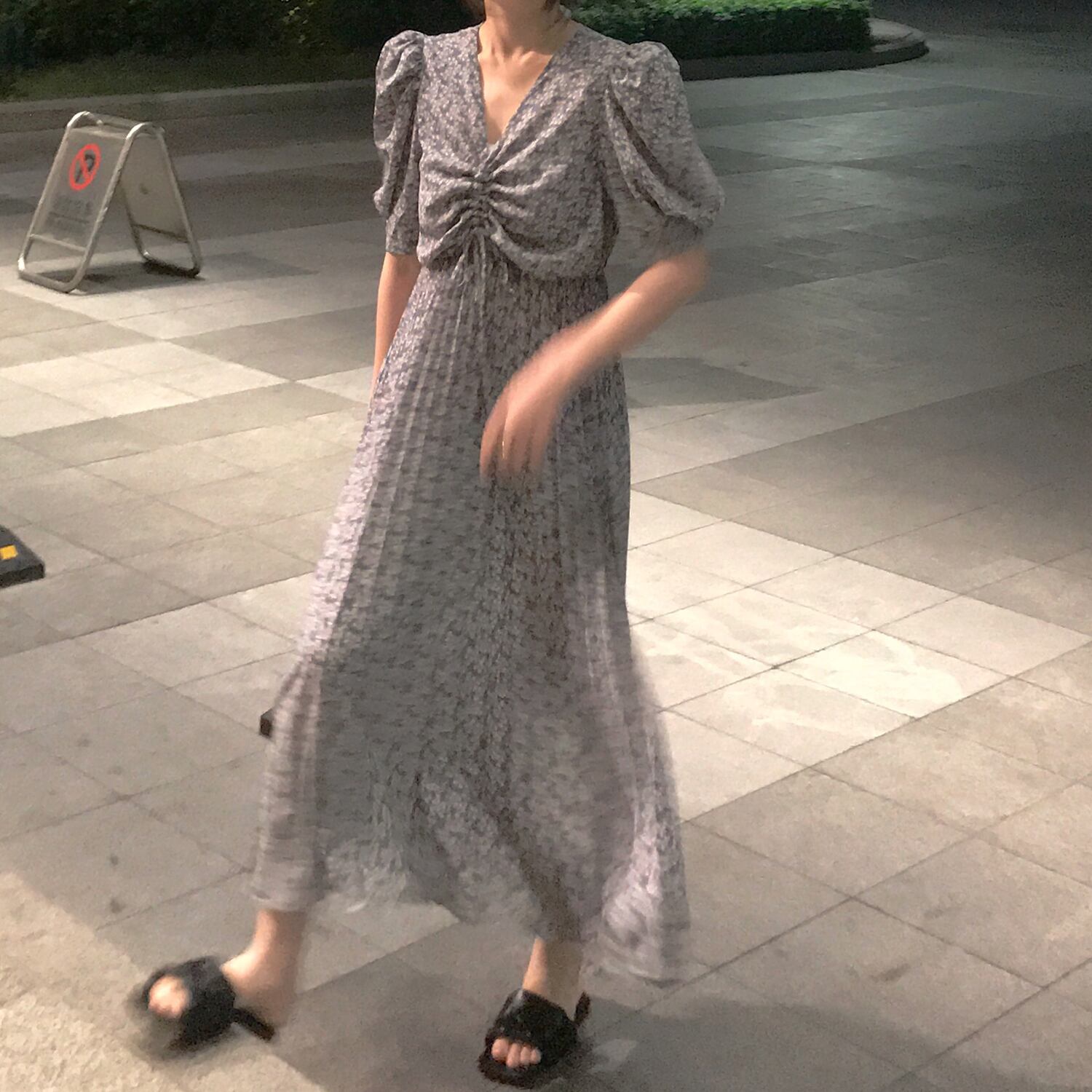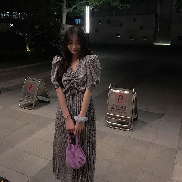 小花柄のプリーツワンピース プリーツワンピース 花柄 レトロ レディース 夏 ブルー ワンサイズ 10代 20代 30代 アラサー Aライン カジュアル ハイウエスト ウエストマーク 脚長効果 シフォン ロング丈 マキシ丈 半袖 Vネック パフスリーブ RB-Z07-00022