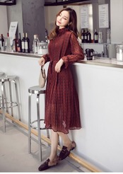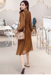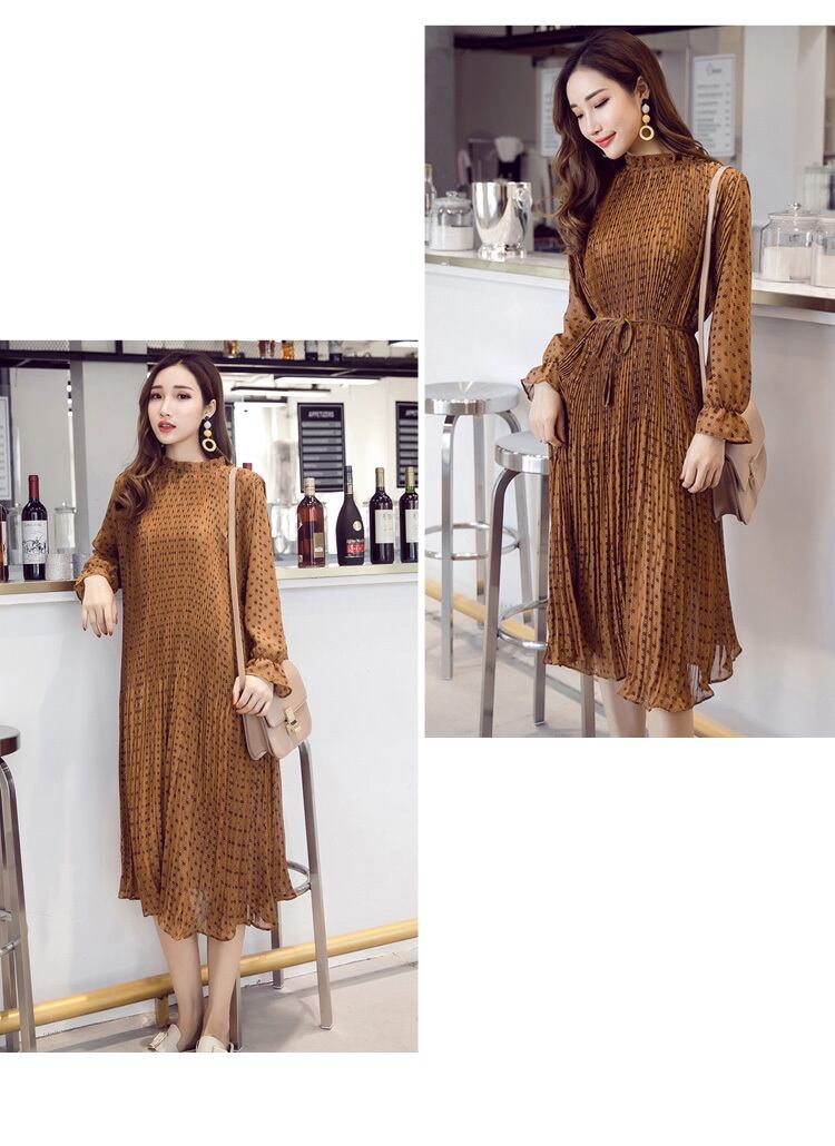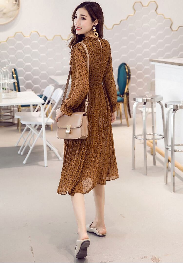 小花柄のプリーツワンピース プリーツワンピース 花柄 レトロ レディース 10代 20代 30代 アラサー Aライン カジュアル ハイウエスト ウエストマーク 脚長効果 シフォン 膝丈 膝下丈 長袖 ゆったり ボトルネック リボン レッド イエロー フリル フレア S M L XL 2XL RB-Z07-00030