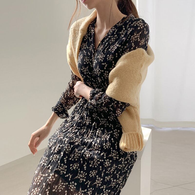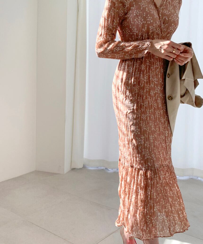 小花柄のプリーツワンピース プリーツワンピース 花柄 レトロ レディース 10代 20代 30代 40代 アラサー アラフォー ハイウエスト ウエストマーク 脚長効果 シフォン ロング丈 マキシ丈 長袖 タイト きれいめ オフィス Vネック オレンジ ブラック ワンサイズ RB-Z07-00034