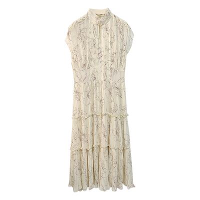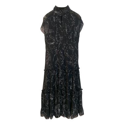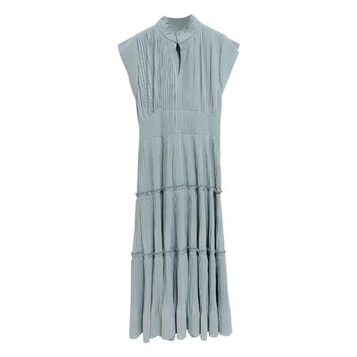 小花柄のプリーツワンピース プリーツワンピース 花柄 レトロ レディース 10代 20代 30代 アラサー Aライン カジュアル ハイウエスト ウエストマーク 脚長効果 シフォン ロング丈 マキシ丈 ノースリーブ 半袖 ボトルネック ブルー ホワイト ブラック レッド リボン S M RB-Z07-00037