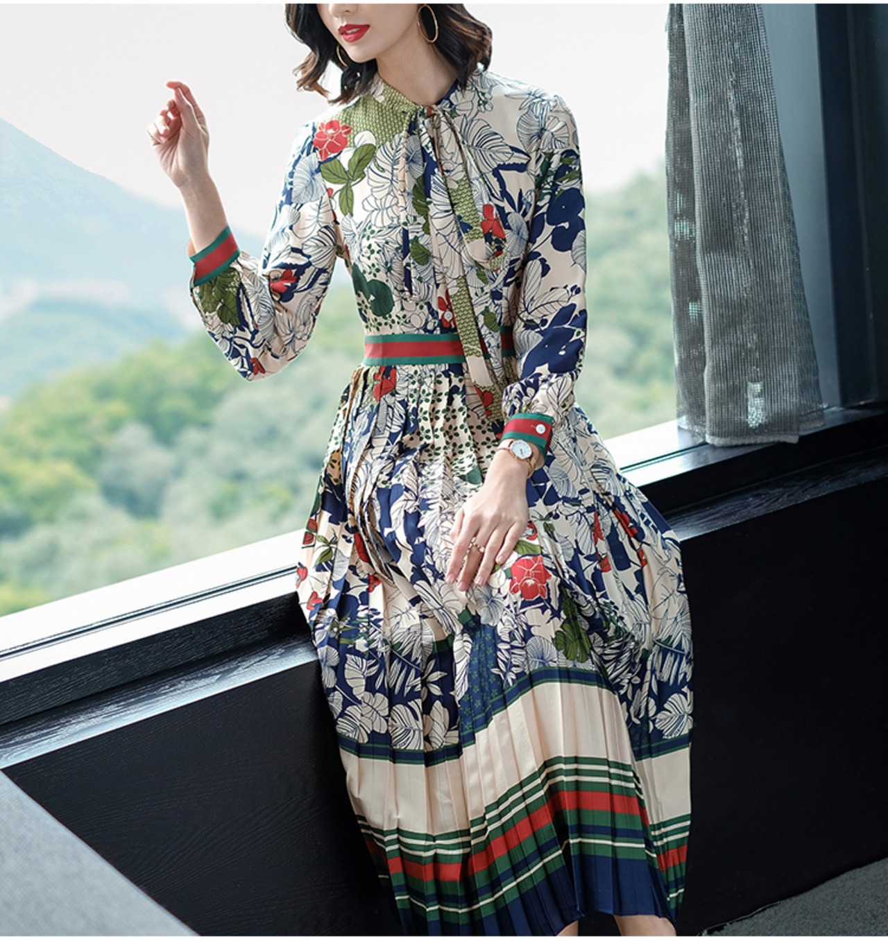小花柄のプリーツワンピース プリーツワンピース 花柄 レトロ レディース 10代 20代 30代 アラサー Aライン カジュアル ハイウエスト ウエストマーク 脚長効果 シフォン ロング丈 マキシ丈 長袖 エレガント ゴージャス お呼ばれ リボン ボトルネック M L XL 2XL RB-Z07-00039
