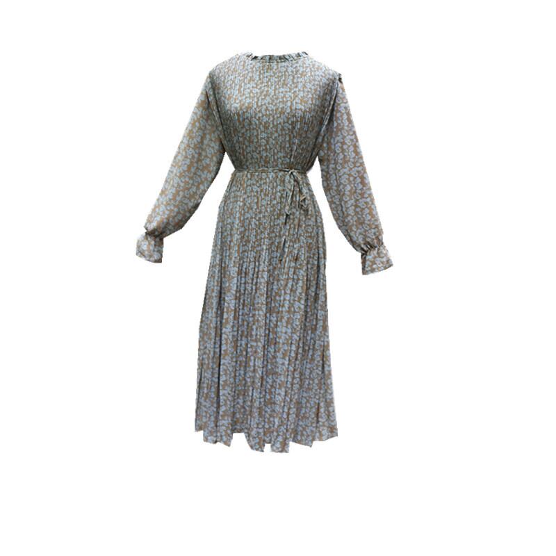 小花柄のプリーツワンピース プリーツワンピース 花柄 レトロ レディース 10代 20代 30代 アラサー Aライン カジュアル ハイウエスト ウエストマーク 脚長効果 シフォン 膝丈 膝下丈 長袖 フリル リボン ゆったり グリーン パープル ブラック ワンサイズ RB-Z07-00041