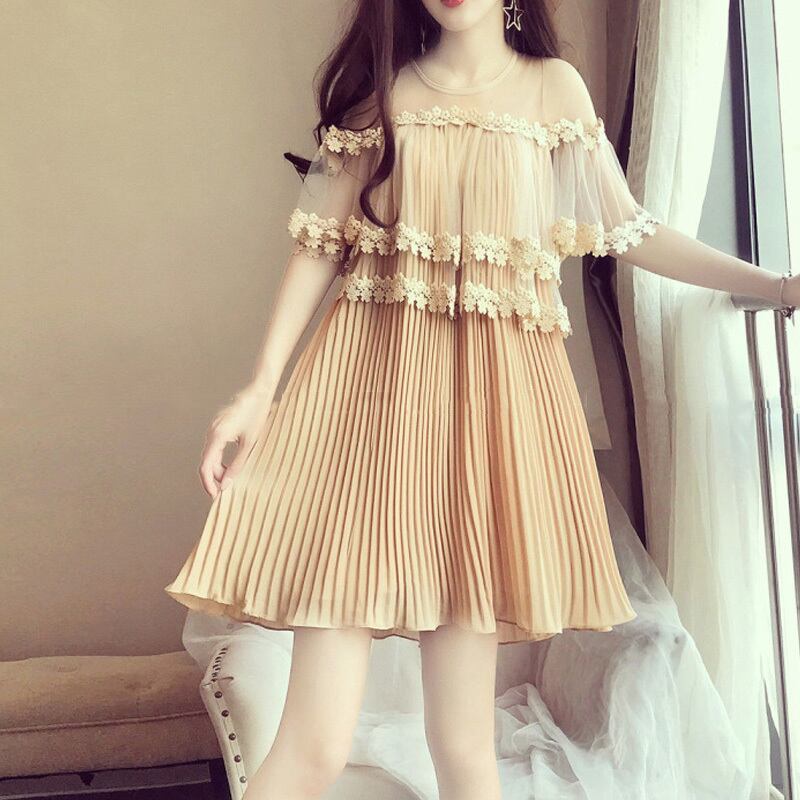 小花柄のプリーツワンピース プリーツワンピース 花柄 レトロ レディース 大きいサイズ 体型カバー 10代 20代 30代 アラサー Aライン パーティー 2次会 お呼ばれ ハイウエスト 脚長効果 シフォン 膝上丈 ミニ丈 半袖 レース ベージュ ブラック L XL 2XL 3XL RB-Z07-00044